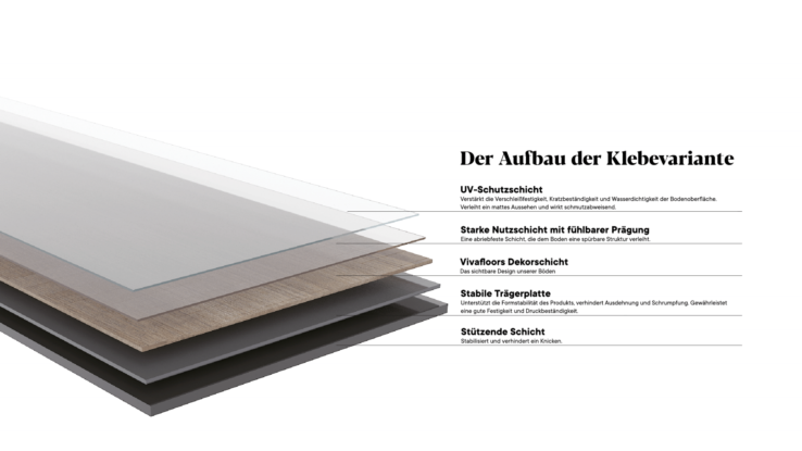 Alle Böden von Vivafloors sind in einer Klebevariante erhältlich. Der robuste Kern in der Mitte sorgt dafür, dass unsere Böden außerordentlich strapazierfähig sind.
