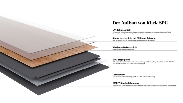 Designbeläge bestehen aus verschiedenen Schichten, die zusammen ein Ganzes bilden. Bei der Herstellung unserer Böden benutzen wir, je nach Anwendungsziel, für die jeweiligen Schichten andere Materialien. So besteht der Kern unserer Klickböden aus WPC, SPC oder EPC, denselben Materialien, die auch im Kern all unserer Klebeböden verarbeitet sind. Ein jeder unserer Böden (egal ob Klebe- oder Klickvariante, WPC, SPC oder EPC) ist mit einer 0,55 mm dicken verschleißfesten Oberschicht versehen.