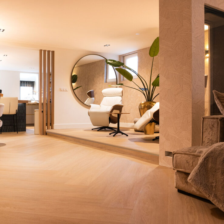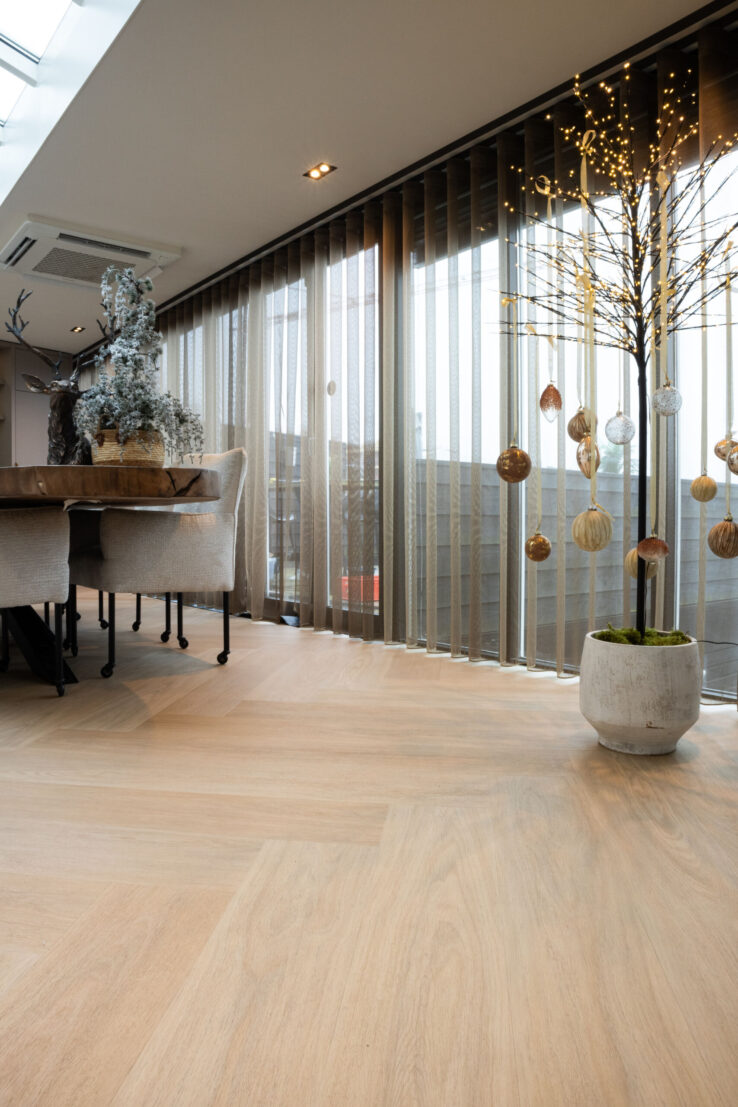 Für das stilvolle Apartment von Debby van der Zande wurde im Wohnbereich der Dinograat 7810 gewählt. Dieser elegante Boden, auch bekannt als unsere lange Eichenplatte 7810, wurde speziell für dieses Projekt in einem einzigartigen Fischgrätmuster verlegt. Im Obergeschoss wurde der Eichenboden 7810 in langen Dielen verlegt, was für eine ruhige und zeitlose Ausstrahlung sorgt.