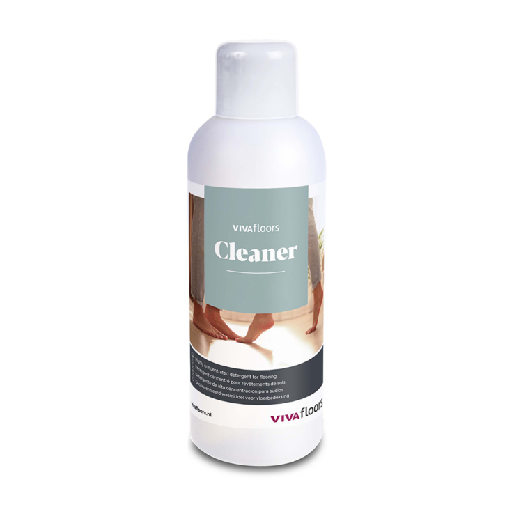Vivafloors Cleaner ist ein hochkonzentriertes, neutrales Reinigungsprodukt. Für das tägliche Wischen mischen Sie 15 – 20 ml des Reinigers mit 1 Liter heißem Wasser. Bei starker Verschmutzung 50 – 60 ml Vivafloors Cleaner auf 1 Liter heißes Wasser verwenden. Unser Vivafloors Cleaner hat eine hohe Entfettungskapazität, sodass Sie Ihren Designbelag mühelos sauber halten können.